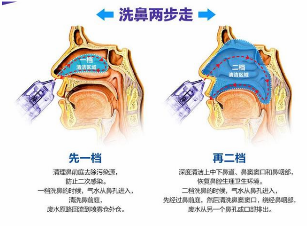 2.沖洗時(shí)不要說話或吞口水,不要用鼻子呼吸,不要捏著兩側(cè)鼻子擤鼻。